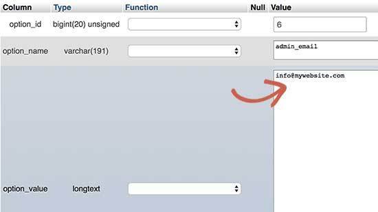 它将显示选项表中的数据行,单击option_name为’admin_email’的行旁边的“编辑”按钮。phpMyAdmin将打开该行,现在可以更改网站的管理员电子邮件。修改后记得保存更改。